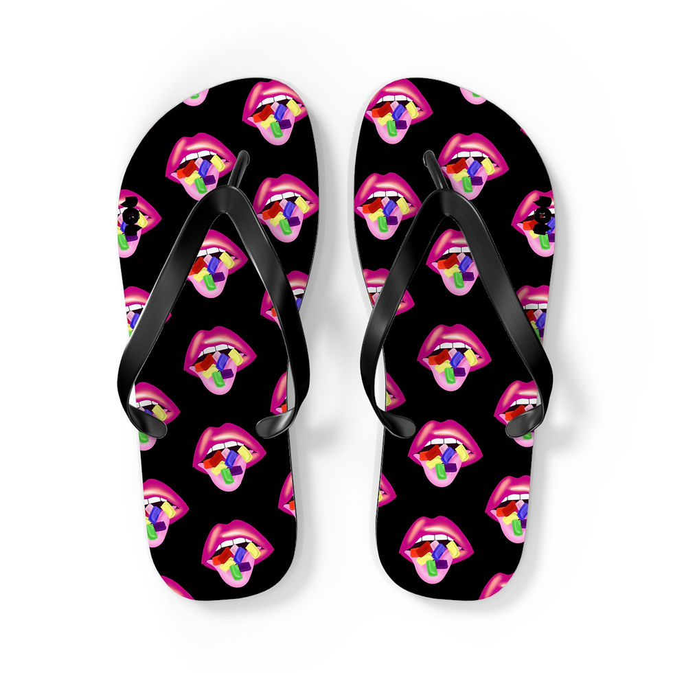 Vibrant Candy/Lip Print Flip Flops, Beach Footwear, Black - Sandals